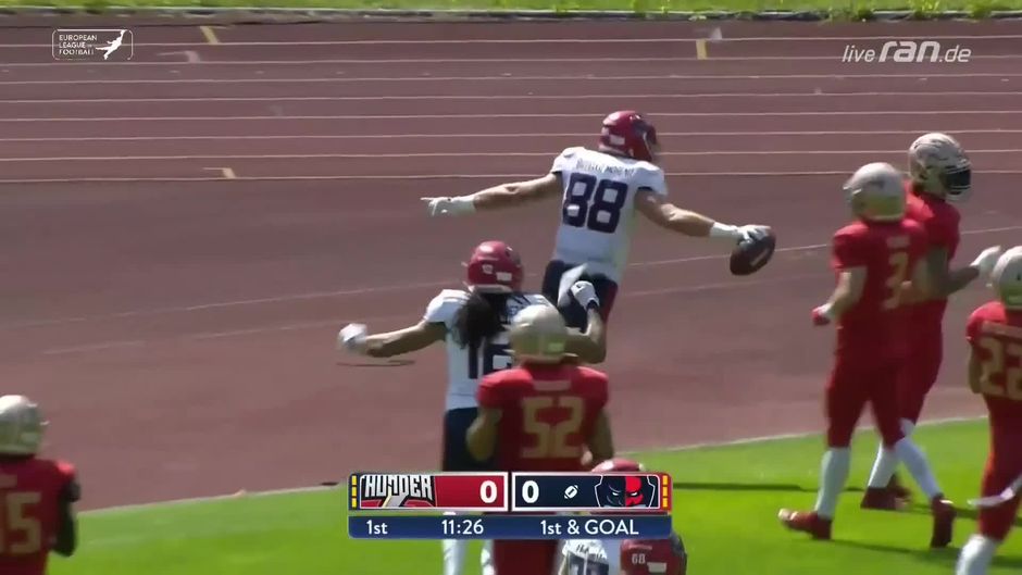Gleich im ersten Drive steht Tight End Adrio Botello Moreno komplett frei in der Endzone der Berlin Thunder. Einfaches Spiel für die Hamburg Sea Devils!