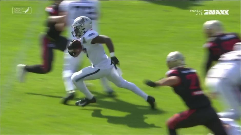 Chuka Austin Okpalobi von den Raiders Tirol lässt alle Defense-Spieler von Berlin Thunder im Regen stehen und marschiert zum Touchdown. Arno Schwarz macht den Extra-Punkt und trifft zum neuen Spielstand von 7:7.