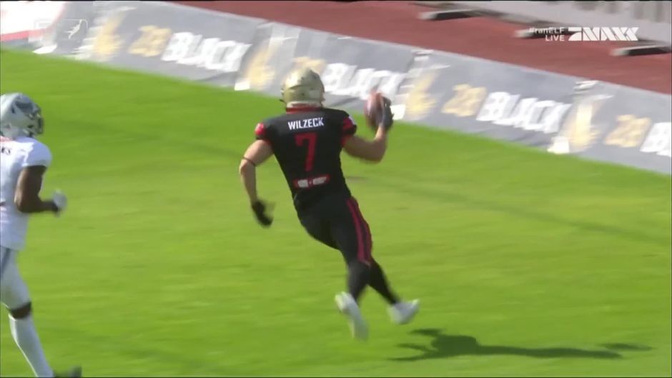 Es ist der erste Spielzug in Berlin und Wide Receiver Robin Wilzeck von Berlin Thunder gelingt nach Pass von Joe Germinerio direkt der Touchdown. Star-Quarterback Jay Liggins von den Raiders Tirol sieht in dieser Szene nicht gut aus.