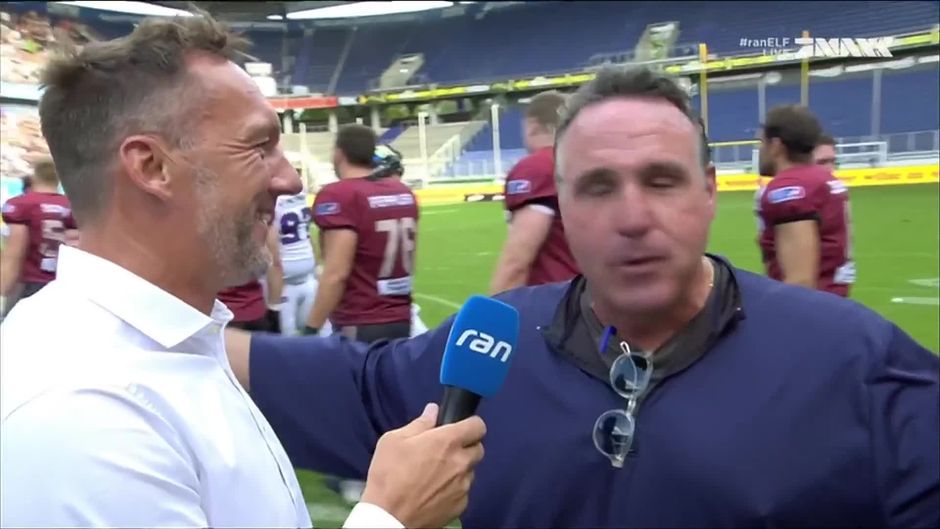 Es war ein Sieg in allerletzter Sekunde! Jim Tomsula, Headcoach von Rhein Fire Düsseldorf, ist völlig mitgerissen von den Emotionen im Stadion, nachdem sein Team den Sieg gegen Frankfurt Galaxy durch ein Field Goal errungen hat.