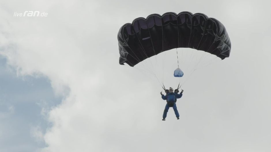 Bei der offiziellen ELF-Ballübergabe verpasst der Fallschirmspringer sein Ziel. Kein Problem, denn Kasim Edebali ist zur Stelle!