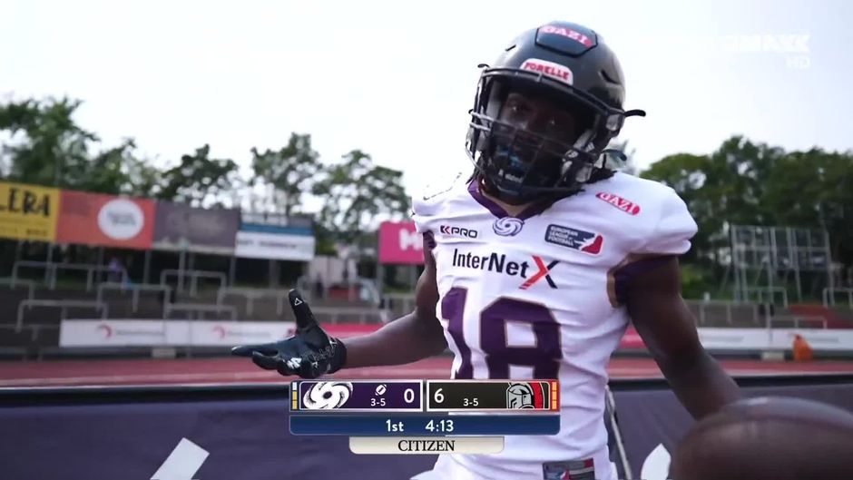 Im Spiel gegen die Cologne Centurions wirft Galaxy-Quarterback Matthew McKay einen perfekten Ball, Receiver Kevin Kaya schnappt zu.