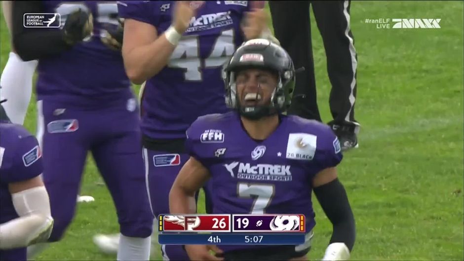 Schon wieder ein Quarterback-Sneak! Jakeb Sullivan macht den Touchdown und Ryan Rimmler das Field-Goal zum 26:26 Ausgleich für Frankfurt Galaxy gegen Düsseldorf Rhein Fire.