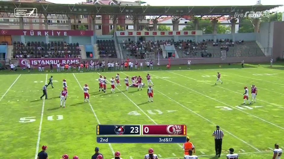 Was für ein Aussetzer! Der Offensive Lineman der Hamburg Sea Devils Dennis Kenzler blockiert den Laufweg seines eigenen Quarterbacks Salieu Ceesay und bringt diesen zu Fall.
