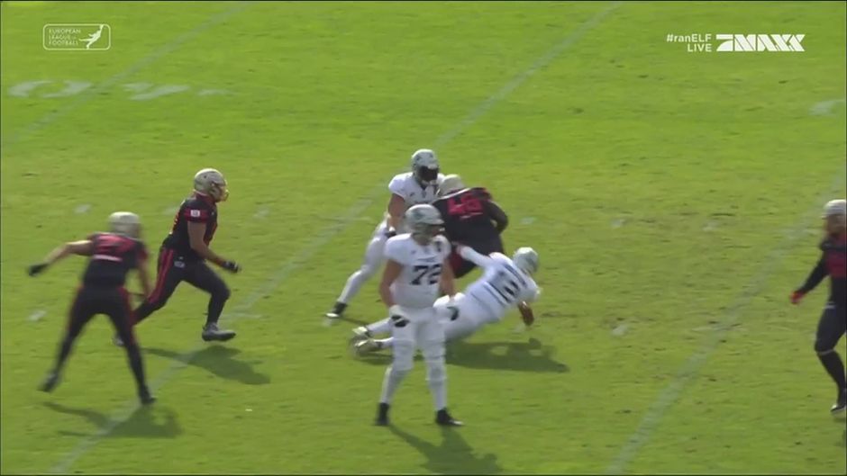 Was war denn da los? Sean Shelton von den Raiders Tirol versucht zu passen, aber Kyle Kitchens von Berlin Thunder ist zur Stelle mit der Interception. Unser Kommentator Volker Schenk ist konsterniert.