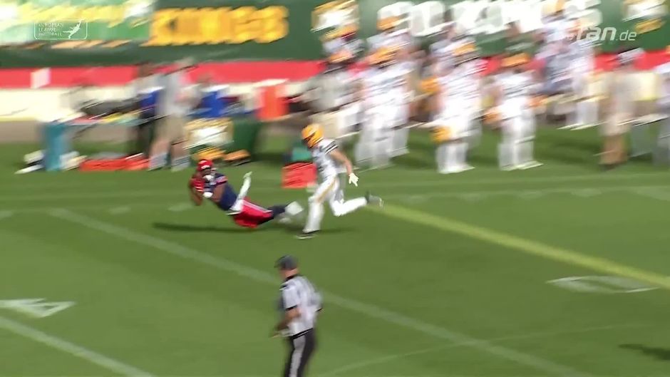 Feinste ELF-Action zwischen den Hamburg Sea Devils und den Kings aus Leipzig. Der Hamburger QB Ceesay findet Jean Constant, der einen sehenswerten Diving-Catch hinlegt.