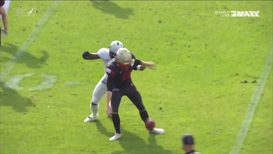 Kevin Hummel, Punter von Berlin Thunder, fängt den Snap nicht. Lucky Ogbevoen von den Raiders Tirol spielt smart, schubst ihn und schlägt den Ball raus.