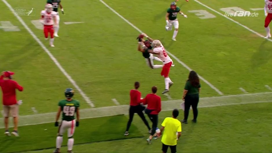 Andy Vera fängt den Pass von Berlins Bryan Zerbe spektakulär ab. Fans und Mitspieler feiern den Spanier.