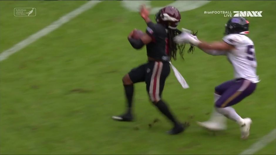 Wilde Szene: Wael Nasri kann Running Back Glen Toonga nur mit einem Griff in dessen Haare festhalten - dem gefällt das natürlich üperhaupt nicht.