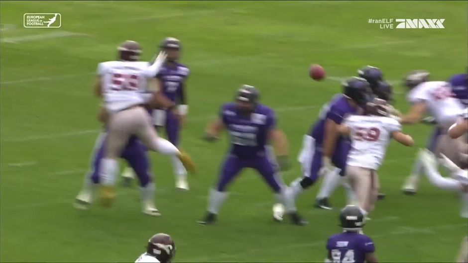 Die Düsseldorf Rhein Fire bestrafen die Fehler der Frankfurt Galaxy eiskalt. Quarterback Jakeb Sullivan wirft in der eigenen Hälfte in die Hände des Gegners. Mit dem Pick Six schockt Rhein Fire die Frankfurter und und sorgt für Totenstille im Stadion.