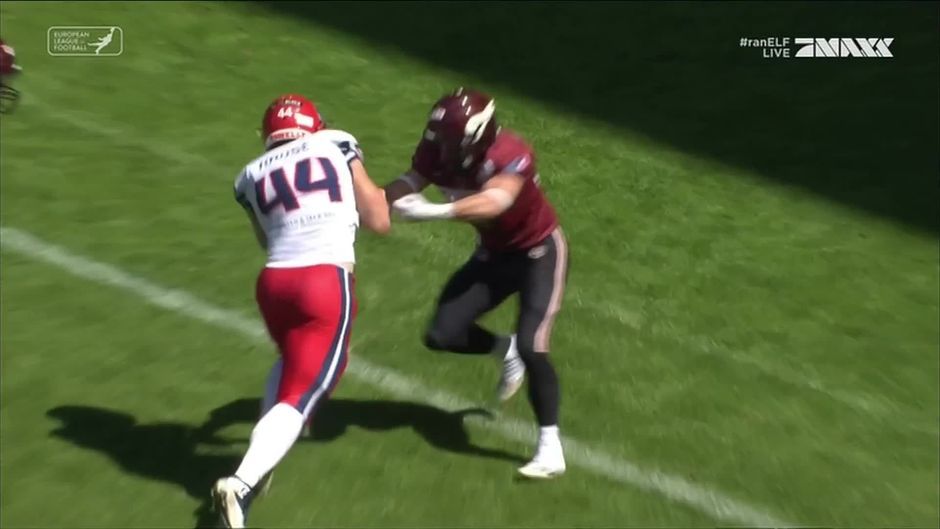 Kurz nach Ende des ersten Quarters muss Rhein Fire schon mächtig aufpassen! Hamburg-QB Ceesay bedient Kruse mustergültig. Das Resultat: Touchdown Nummer zwei für die Sea Devils.