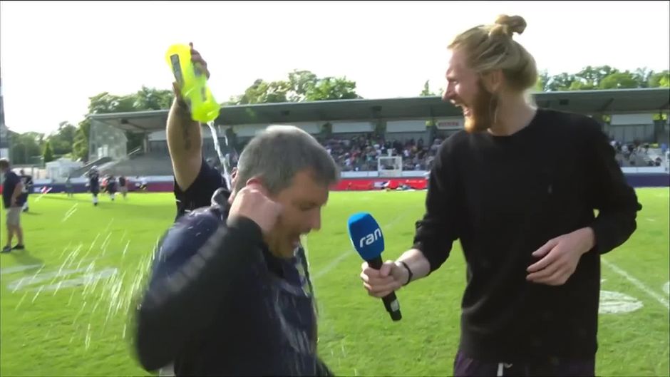 Martin Hanselmann bekommt im ran-Interview nach dem Sieg seiner Stuttgart Surge eine Wasserdusche.