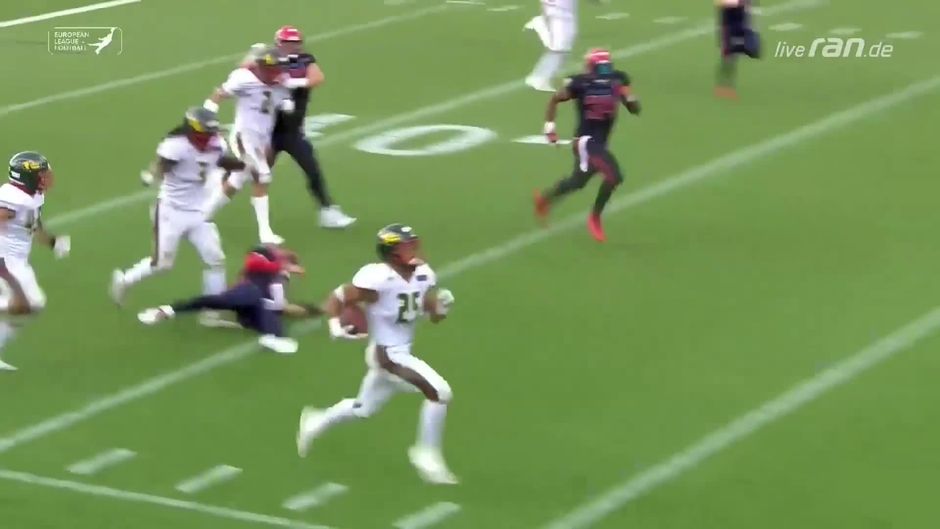 Der Deutsche in den Reihen der Barcelona Dragons erst mit der Interception und dann bringt Niko Lester auch noch den Ball in der gegnerischen Endzone unter.