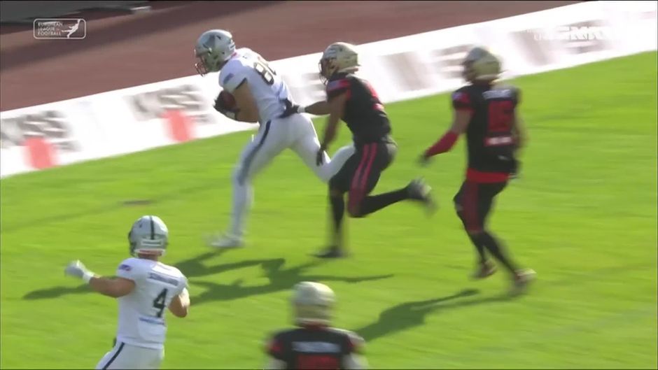 Nach einem perfekten Pass von Sean Shelton fängt Lukas Fink den Ball und macht den Touchdown für die Raiders Tirol. Mit einer Führung von 30:10 gegen Berlin Thunder machen die Innsbrucker damit den Sack zu.