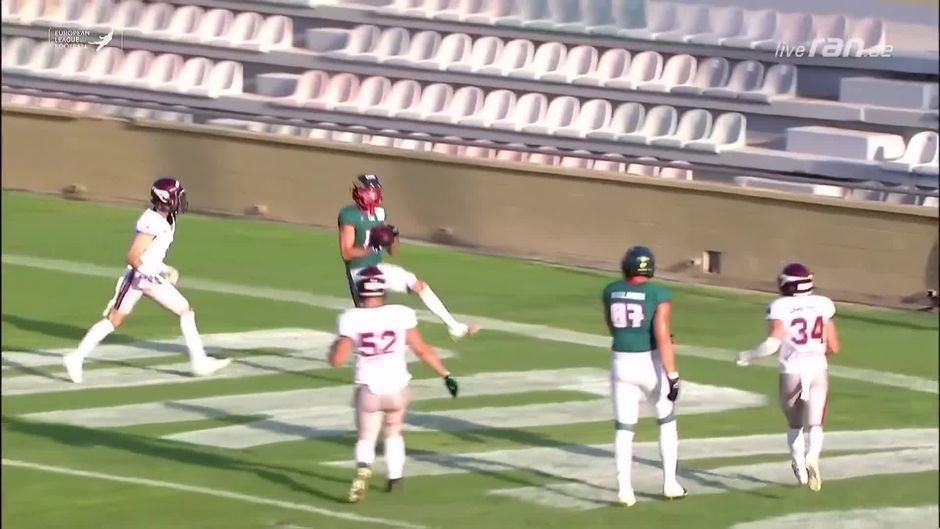 Die beiden finden sich immer! Quarterback Zach Edwards und Wide Receiver Kyle Sweet von den Barcelona Dragons machen mit dem Touchdown alles klar. Rhine Fire hat gut gespielt, aber die Dragons waren zu stark.
