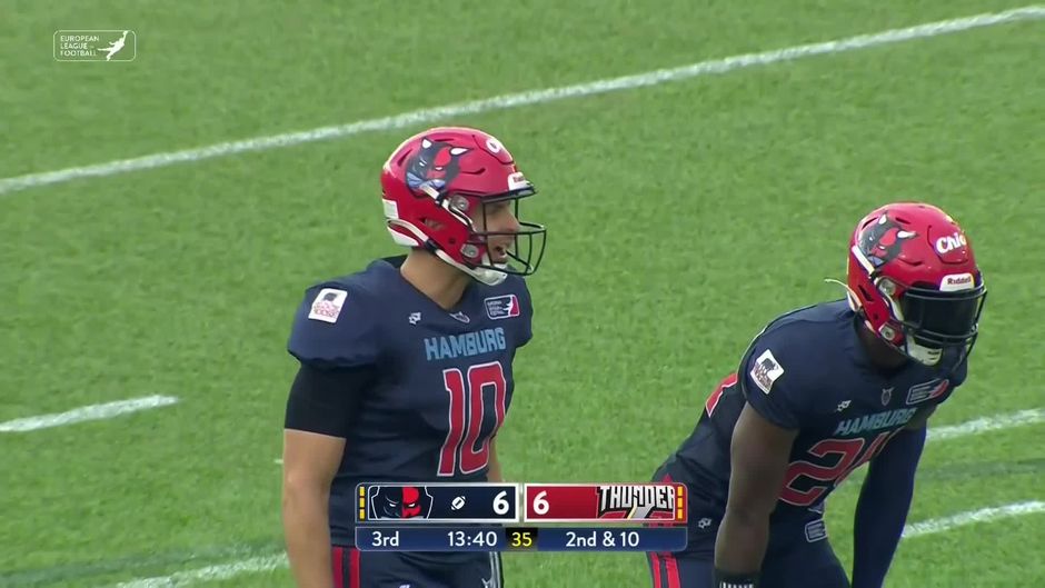 Jadrian Clark überzeugt gegen die Berlin Thunder mit zwei starken Plays hintereinander und führt die Hamburg Sea Devils zu einem starken Touchdown.