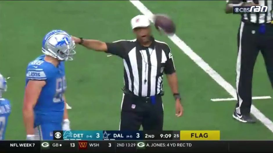 Der Schiedsrichter will gerade ein Holding für die Detroit Lions ansagen, als er von Jamaal Williams aus Versehen den Ball an den Kopf bekommt. Die Aktion seht ihr im Video.