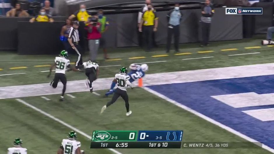 Colts Runningback Nyheim Hines brachte den Football im Thrusday Night Match gegen die New York Jets sicher in der Endzone unter. Ein besonderer Hingucker war dabei der Jubel den Hines anschließend auspackte.