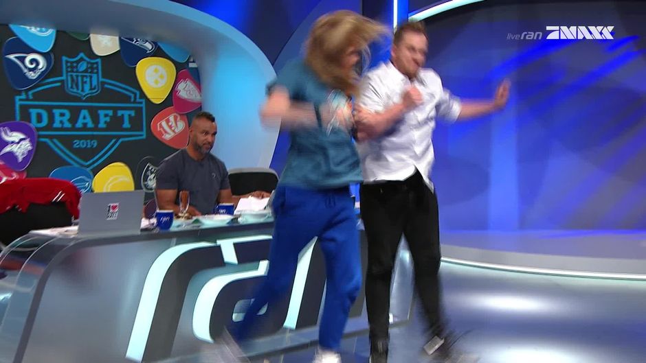 Angestachelt von Christian Wilkins nimmt Icke Anlauf um den Shoulder-Bump mit College-Experte Nils Müller zu machen.