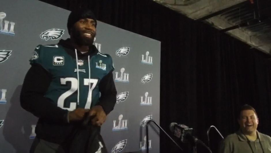 Patrick Esume hat ein persönliches Anliegen und möchte von Malcom Jenkins unbedingt wissen, wann seine Modelinie nach Deutschland kommt.