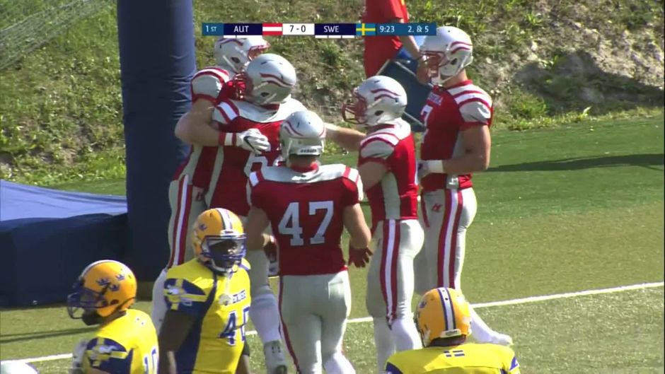 Nach der Interception wandelt die österreichische Nationalmannschaft im Spiel gegen Schweden bei der Football-EM in Finnland den folgenden Drive in die nächsten Punkte um - Einfach per Run in die Endzone.