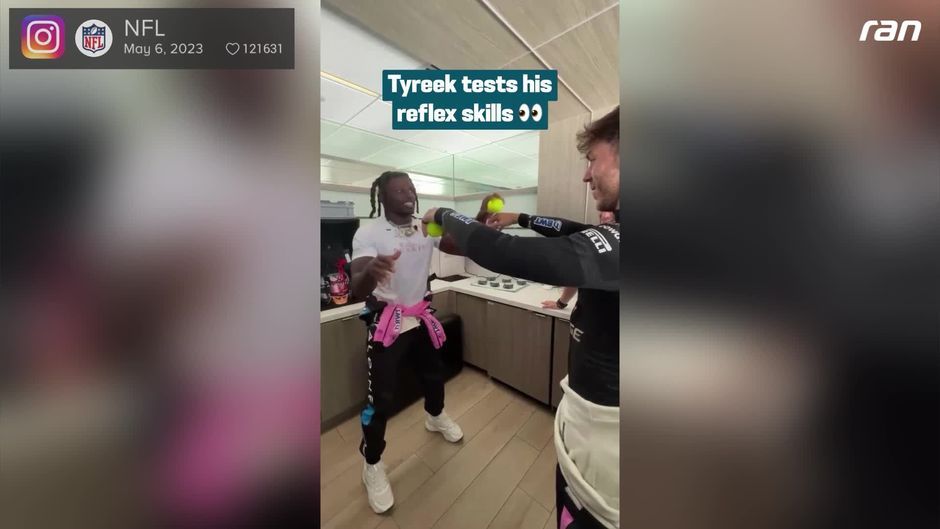 Dolphins-WR Tyreek Hill zeigt zusammen mit Formel-1-Pilot Pierre Gasly seine unglaublichen Reflex-Skills. Andrew van Ginkel darf beim Boxenstopp Reifen wechseln.