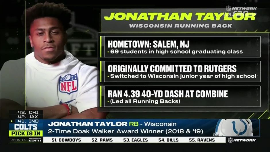 Trade-Alarm an Position 41. Die Indianapolis Colts holen sich den Pick von den Cleveland Browns und wählen Running Back Jonathan Taylor von der Wisconsin Universität aus.
