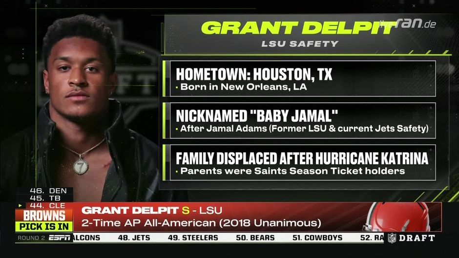 Mit Pick Nummer 44 sichern sich die Cleveland Browns Safety Grant Delpit von LSU.