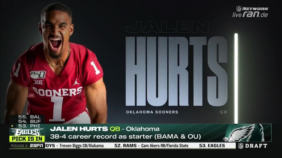 Mit dem 53. Pick holen die Philadelphia Eagles Quarterback Jalen Hurts aus Oklahoma.