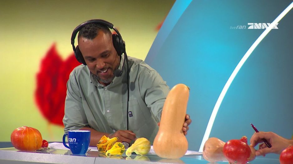 Die ran-Community sieht in der Tischdeko mehr als nur einen Kürbis. Coach Esume, Sebastian Vollmer und Icke haben ihren Spaß.