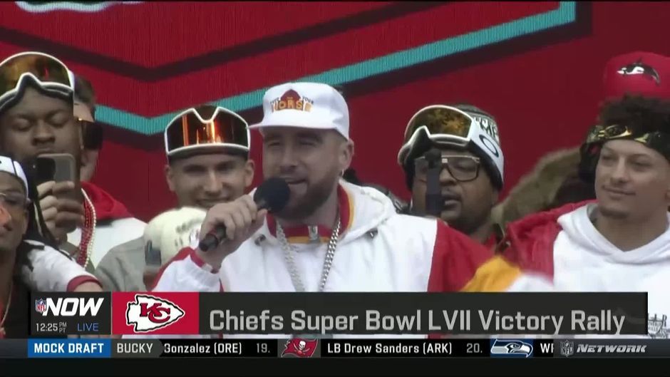 Fan-Liebling Travis Kelce hat die Masse bei der Victory-Parade in Kansas City ordentlich zum Kochen gebracht. Der Tight End der Chiefs überzeugt am Mikrofon genau wie auf dem Rasen und unterstreicht seine Liebe zum Chiefs Kingdom.