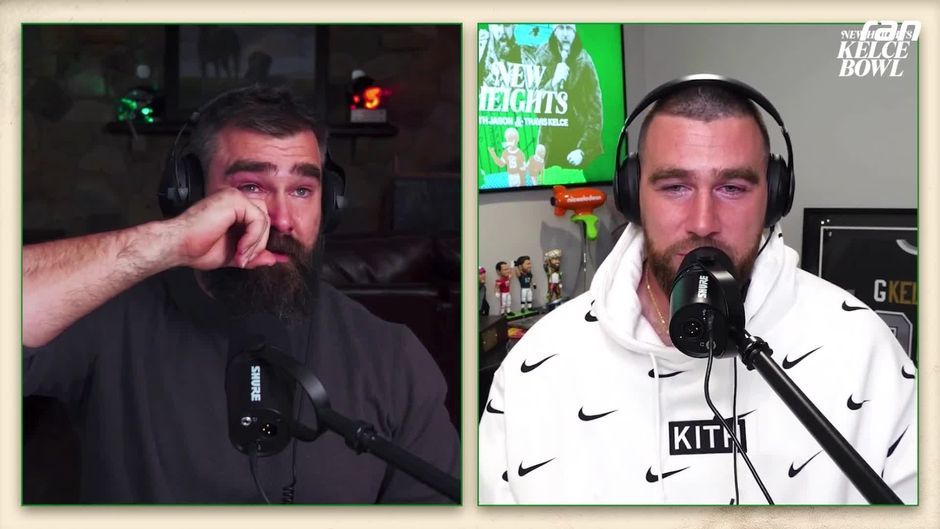 Nach dem Super Bowl sprechen die beiden Brüder Travis und Jason über ihre Mutter und bekommen dabei Tränen.