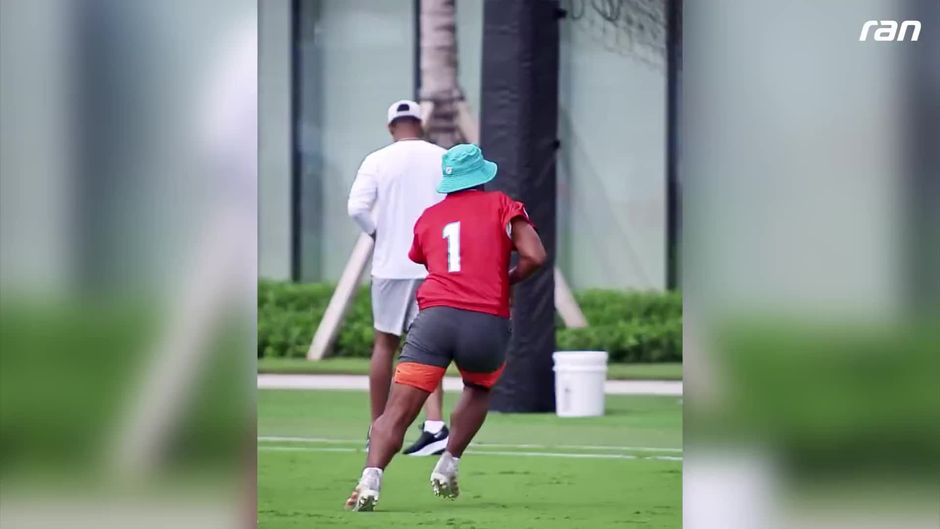 Tyreek Hill fängt die ersten Bälle an der Dolphins-Facility in Miami, doch die Fans haben nur Augen für Tua Tagovailoa.