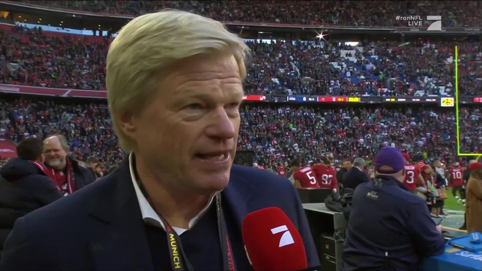 Oliver Kahn muss das etwas andere Feld in der Allianz Arena erstmal verarbeiten. Der Einlauf von Tom Brady sorgt beim Titan für Gänsehaut.