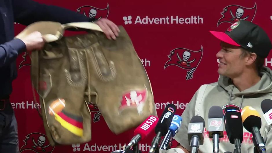 Wenn Tom Brady schon mal in München ist, dann muss das auch mit einem traditionellen Präsent gewürdigt werden. ran beschenkt den "GOAT" mit einer Lederhose im Buccaneers-TB12-Style - sehr zur Freude Bradys.