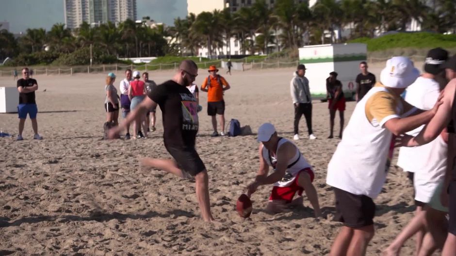 In der NFL verdiente Björn Werner sein Geld als Linebacker. Dabei hätte der ran-Experte auch einen passablen Kicker abgegeben - wie er am Strand von Miami eindrucksvoll beweist. Ebenfalls stark: Jan Stecker als Holder.