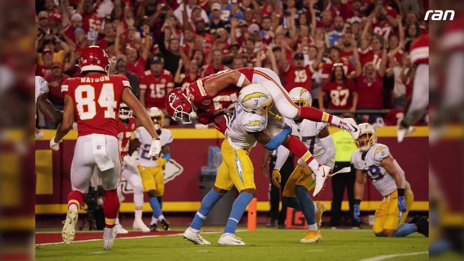 Tight End Travis Kelce hat die Endzone schon im Blick, hat aber nicht mit Derwin James gerechnet. Der Safety der Los Angeles Chargers bringt den 118-Kilo-Mann mit einem krachenden Bodyslam zu Boden und verhindert den Touchdown.