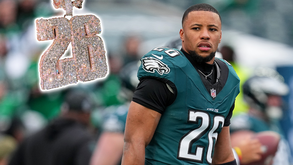 Saquon Barkley bekommt nach dem Triumph im Super Bowl gegen die Kansas City Chiefs eine neue Kette überreicht - und die funkelt und glitzert nur so!