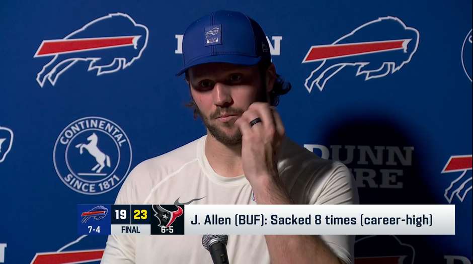 Josh Allen erlebt im Spiel gegen die Houston Texans einen wahren Albtraum. Der Quarterback der Buffalo Bills wird ACHT Mal gesackt. Dementsprechend frustriert ist er nach der knappen 19:23-Pleite.