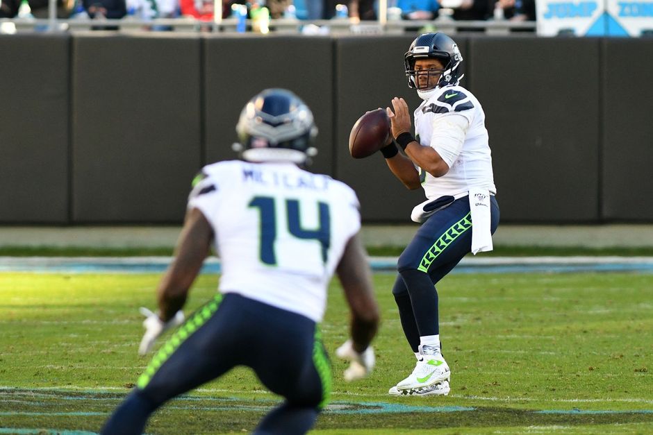 Russell Wilson und DK Metcalf stehen wieder zusammen auf dem Footballfeld - zumindest für einen Moment. Die Ex-Teamkollegen scheinen sich noch bestens zu verstehen!