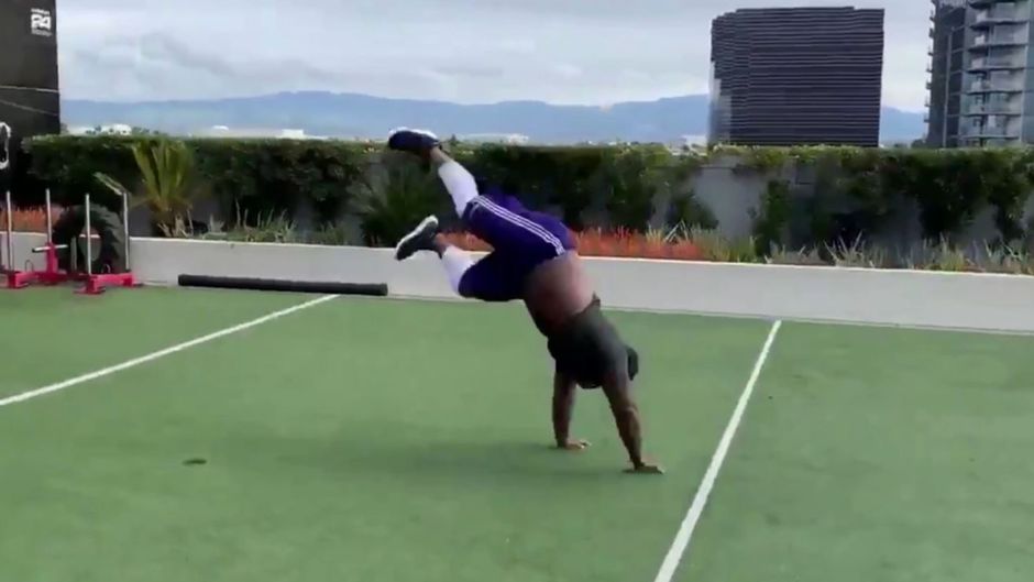 Rückwärtssalto aus dem Stand mit 150 Kilo - für Khalen Saunders von den New Orleans Saints eine Leichtigkeit.