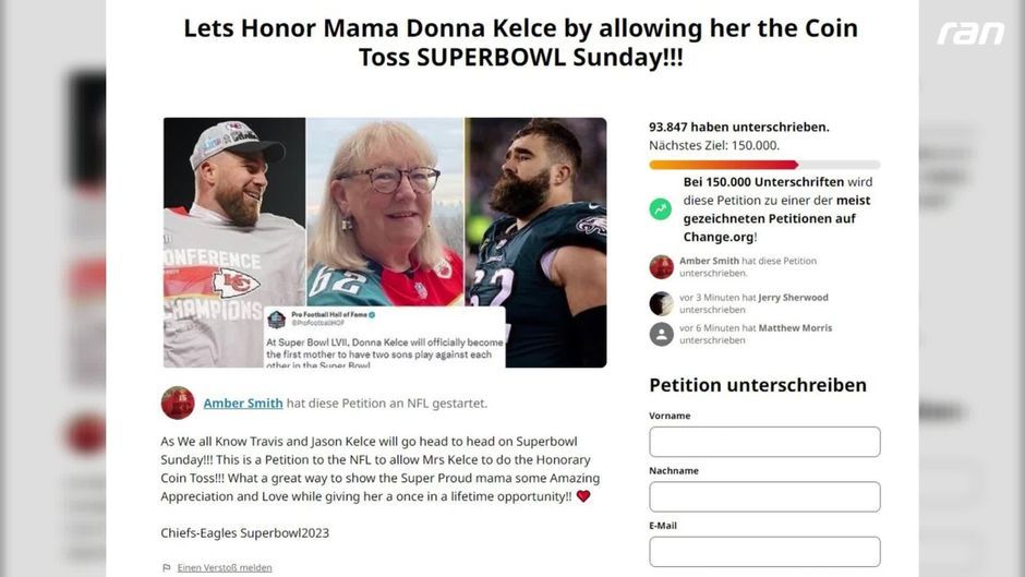 Die Netzgemeinde ist sich sicher: Sie wollen Mama Kelce beim Super Bowl sehen! Es gibt eine Onlinepetition, die sich dafür ausspricht, dass Donna Kelce den Münzwurf vor dem Duell der Chiefs und Eagles durchführt.
