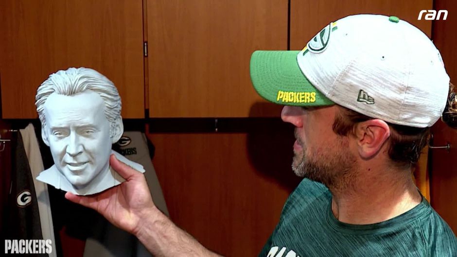 Nach seinem "Con Air" - Auftritt beim Packers-Training-Camp hat Aaron Rodgers jetzt eine Büste von NIcholas Cage geschickt bekommen - und direkt in seiner persönlich Umkleide drapiert.