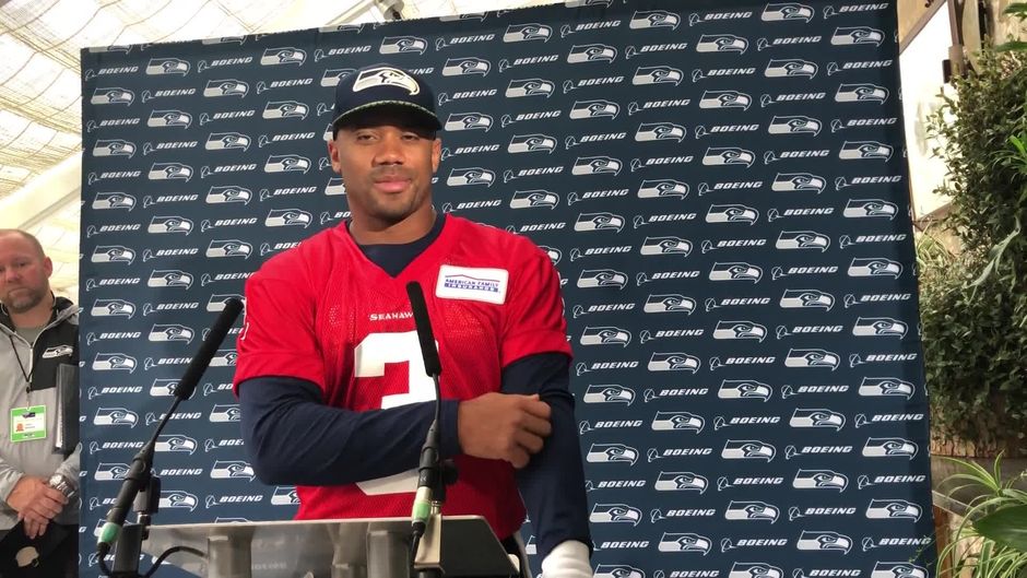 Seahawks-Quarterback Russell Wilson spricht beim Presse-Termin zum London-Game über die europäischen/deutschen Fans, die "besondere Energie" in London und Markus Kuhn.