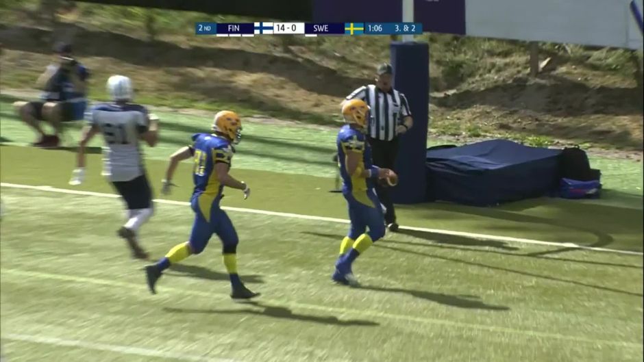 Bei der Football-EM kann die schwedische Nationalmannschaft endlich Punkte erzielen und damit verkürzen. Der Quarterback behält das Ei und erzielt den Touchdown.