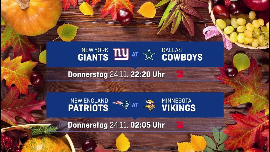 Leckerbissen am Donnerstag, den 24.11. Zuerst sind die New York Giants zu Gast bei den Dallas Cowboys. Als Nachspeise empfangen die Minnesota Vikings die New England Patriots. Ab 22:20 Uhr live auf ProSieben.