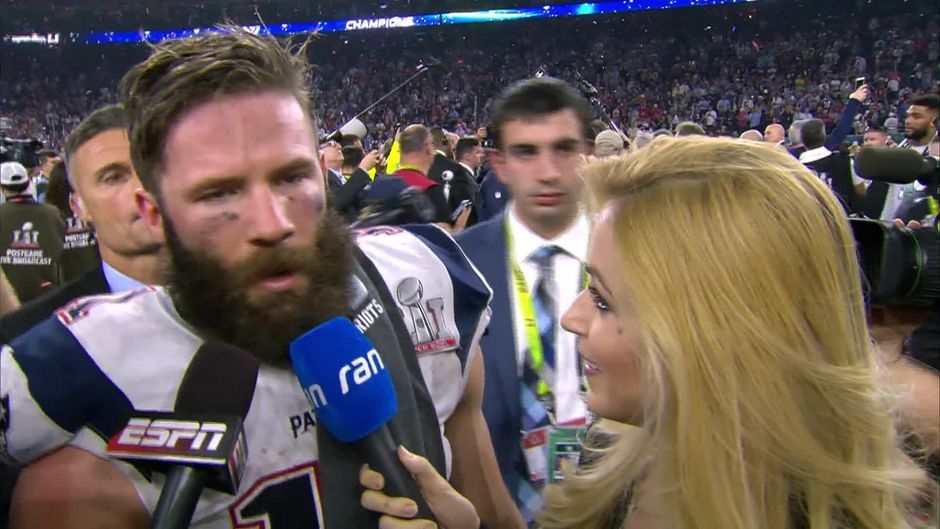 Wenige Minuten nach dem Gewinn des Super Bowl LI steht Julian Edelman bei Andrea Kaiser am ran-Mikrofon! Der Wide Receiver der Patriots denkt an seine kleine Tochter und an seine Großeltern.