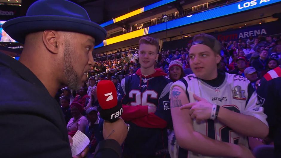 Coach Esume unterhält sich mit einem Superfan der New England Patriots, der sich bereits im August ein Super-Bowl-53-Sieger-Tattoo hat stechen lassen.
