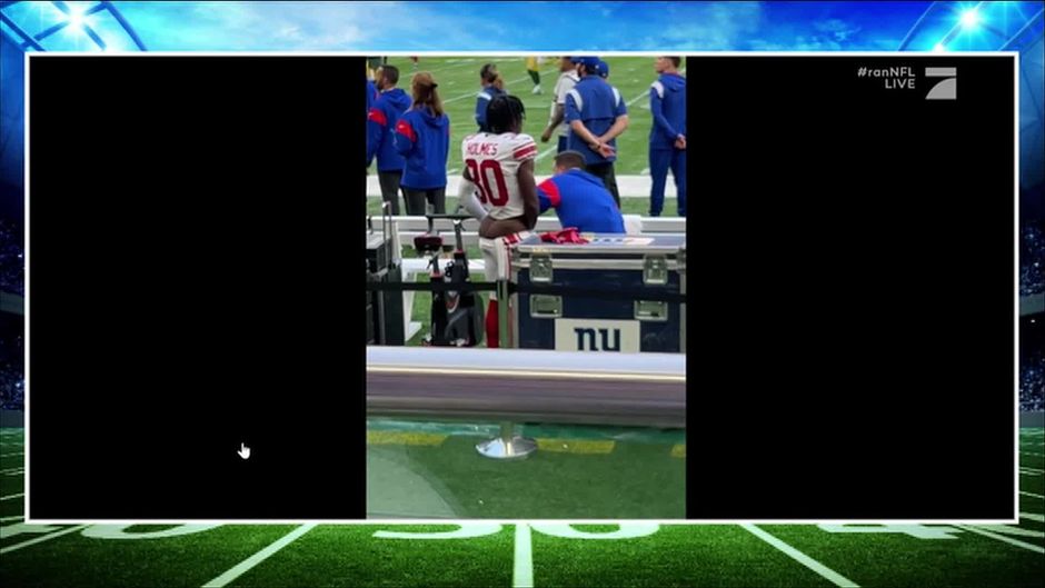 Was genau ist da denn los an der Sideline der New York Giants. Mit Sicherheit nur eine leichte Verspannung in der Leistengegend.
