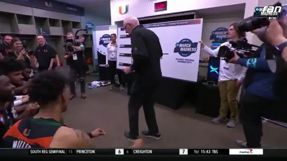 March Madness Überraschung! Die Miami Hurricanes haben als Außenseiter im NCAA-Tournament Houston geschlagen und stehen im Viertelfinale. Der Miami-Coach feiert das mit einem Tänzchen.